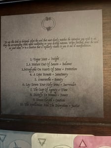 Released as a CD in a high gloss 4 panel wallet with a printed deck of specific sigil cards (each card corresponds to a track on the album), beautifully drawn and designed by artist Lot1113, and enveloped in a hand dyed and printed bag. Also included is an instructional sheet on how to use these cards for practical cartomancy.